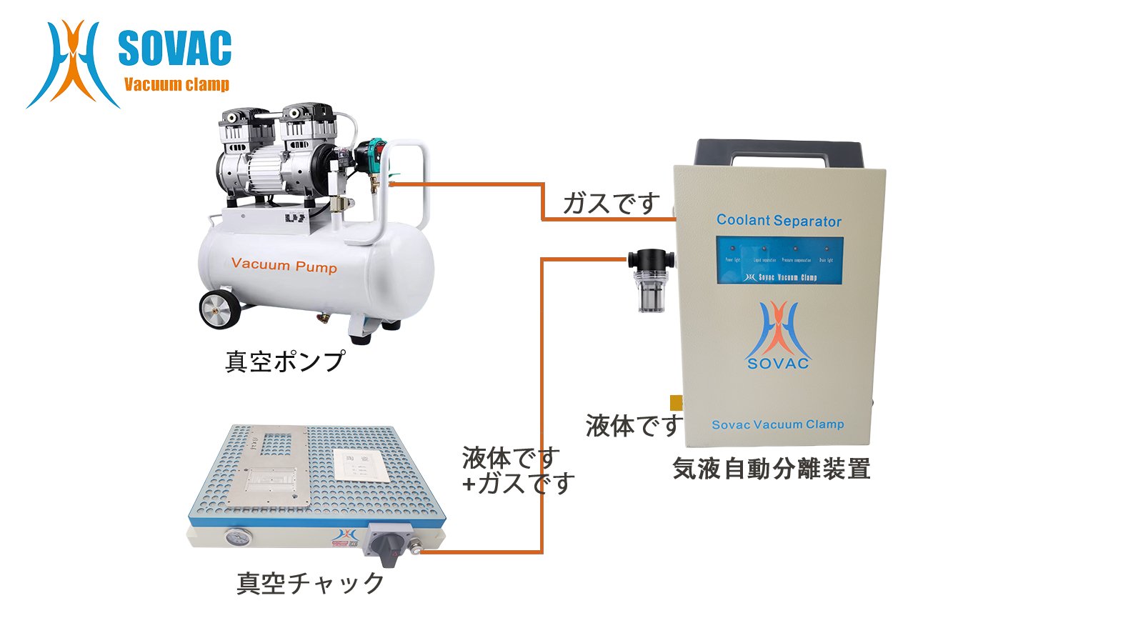 クーラントは真空ポンプにダメージを与えるだけでなく、ポンプ速度にも影響を与え、その結果、真空チャックの吸引力にも影響を与えます。そのため、真空チャックに入るクーラントを分離することが不可欠です。気液分離器の目的は、まさに真空チャック内の液体と気体を分離することです。真空チャックが作動する際、不注意で液体(切削液や水蒸気など)を吸い込むことがあります。この液体が真空ポンプに到達すると、ポンプを詰まらせたり損傷させたりして、ポンプの寿命を縮める可能性があります。自動気液分離器は、このような液体が真空ポンプに入るのを防ぎ、正常な動作を保証します。